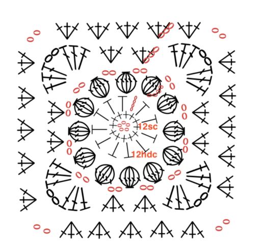 Each side is[3dc, ch 2, 3dc ] [3sc]  [3sc] [3dc, ch 2, 3dc ]