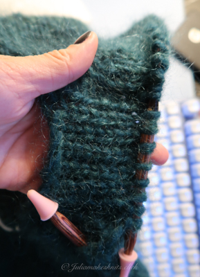 - Using the backwards loop method, cast on 5 extra stitches on the right needle to bridge the gap under the arm and connect the back to the front. I followed instructions from here.